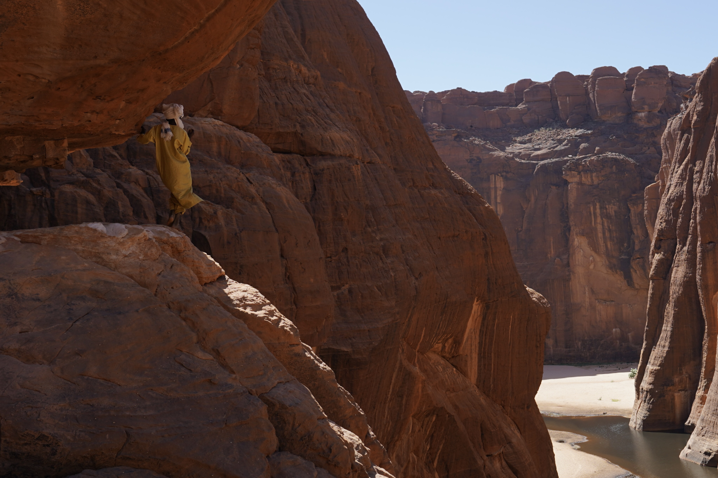 We explored the Guelta d’Archei – a narrow, palm-lined canyon where permanent pools of water lie hidden between sheer rock walls. This is home to one of the world’s last remaining populations of Saharan crocodiles: a small, relict population surviving in isolated desert pools left behind as the climate dried and vast palaeo-river systems across the Sahara gradually receded.